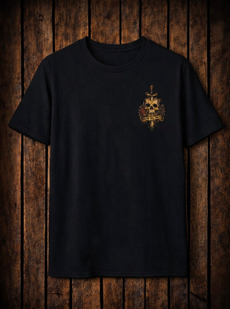 Skulls, roses and a dagger converge into this sick shirt that feels lived-in and rebellious. The front has a small chest motif; the back delivers the full, distressed artwork reading “Dead Men Tell No Tales.” Wear it low and layered, or let the back art be the statement.